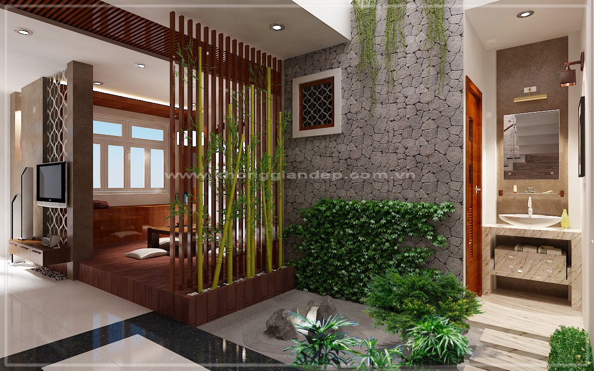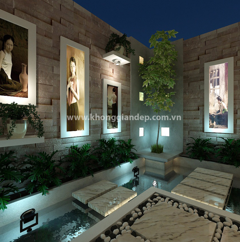 Hình 6, hình 7 : Trang trí khu vực thông tầng và sân vườn khai thác chất liệu từ hình ảnh vườn dân gian với đặc tính mộc mạc, gần gũi, ấm cúng.