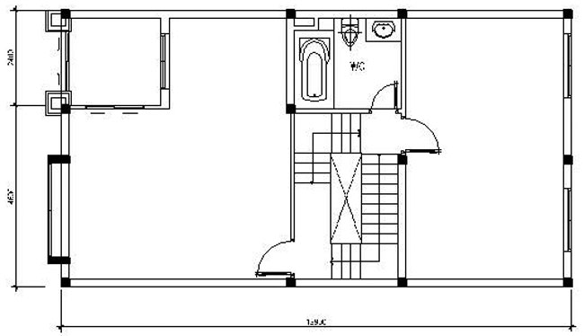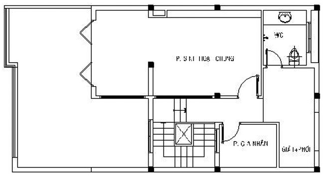 Tầng trệt được thay đổi bằng cách lùi vào để chừa thêm diện tích bên ngoài cho sân đậu xe hơi. Phòng vệ sinh ở ngay giữa nhà được đưa vào dưới chân cầu thang. Phòng khách được bố trí ngay ở tầng trệt nhìn thẳng ra khoảng sân có cây và hồ nước. Lầu 1 có chiều cao đến 3,6m cho cảm giác hơi bị lạc lõng khi sử dụng làm phòng ngủ. Người thiết kế đã xử lý độ cao bằng cách chia không gian làm hai cấp độ. Phía trên cao dành cho nơi làm việc, phòng vệ sinh. Phía thấp dành cho giường ngủ, việc phân chia này đem lại nét khác biệt cho phòng ngủ tạo nên sự thú vị với cảm giác thay đổi. Lầu 2, cầu thang được xoay vế để tăng diện tích cho phòng giải trí.