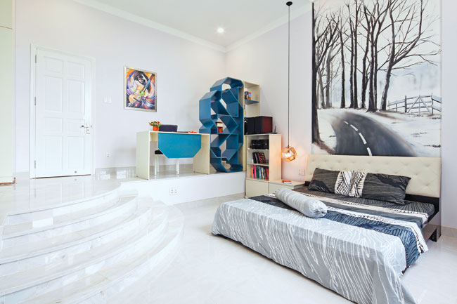 Ảnh trên, phải: Phòng giải trí như một phòng chiếu phim mini. Ảnh trái và ảnh dưới, phải: Góc làm việc nằm trong phòng ngủ. Góc tủ quần áo lượt bớt mọi chi tiết và màu sắc. Phòng trẻ em với các bức tranh từ những bộ phim yêu thích.