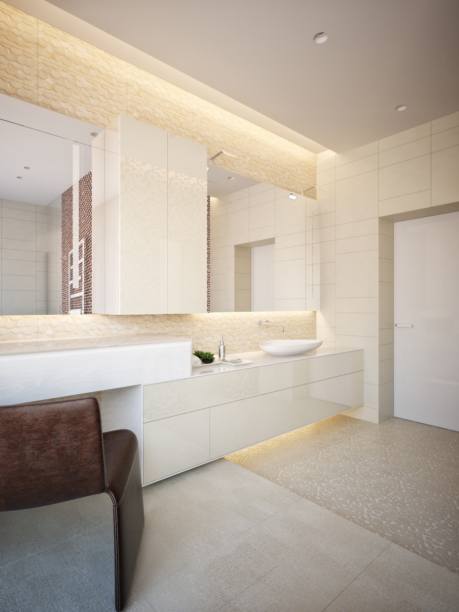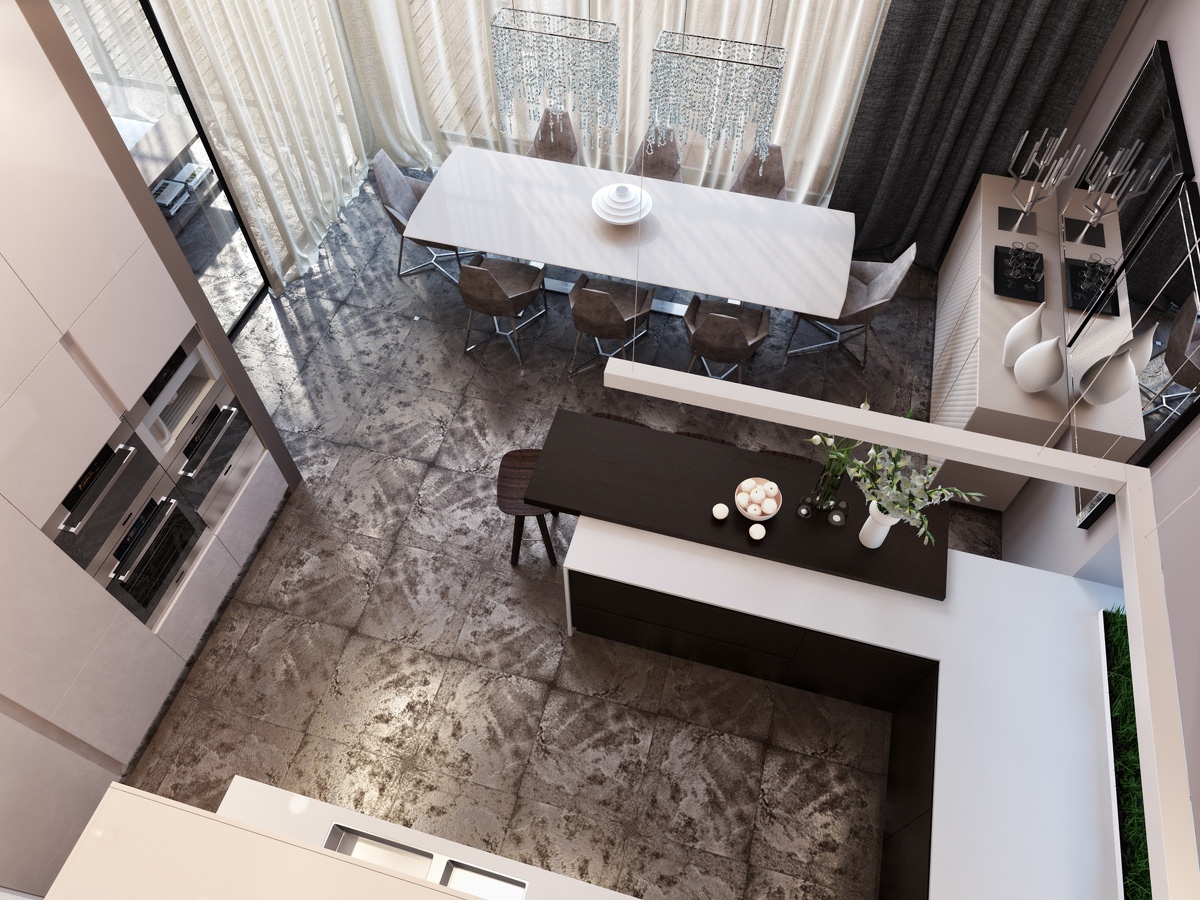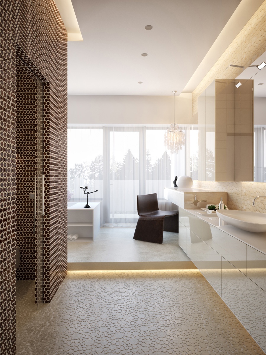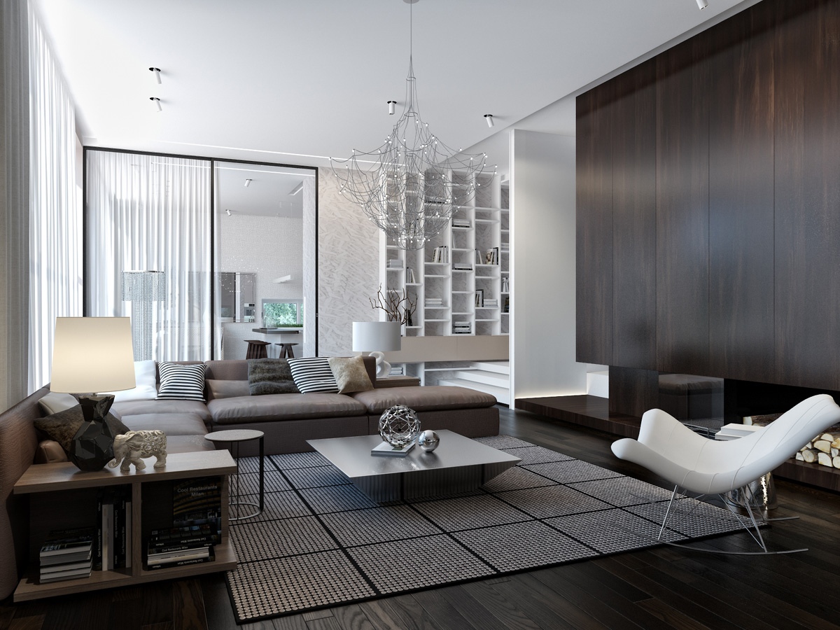 Nội thất nhà ở phong cách hiện đại thiết kế bởi công ty Azovkiy & Pahomova nước Nga nổi bật với hoa văn trang trí ấn tượng. Tông màu trung tính chủ đạo trong nội thất thông qua các yếu tố chất liệu và hoa văn trang trí gây kích thích cảm giác mới lạ một cách trực quan. Gỗ tự nhiên màu tối, đá ốp tự nhiên, chất liệu kim loại kết hợp với hoa văn đặc sắc của thảm lót kiến tạo một không gian sống quyến rũ.