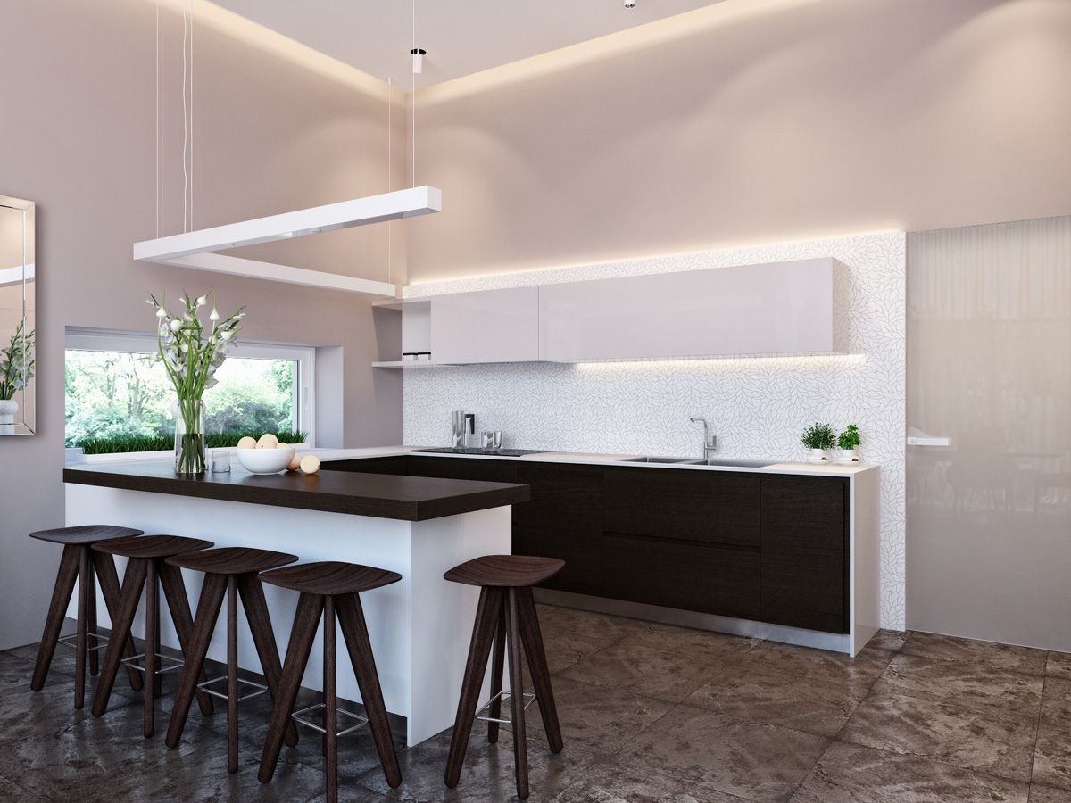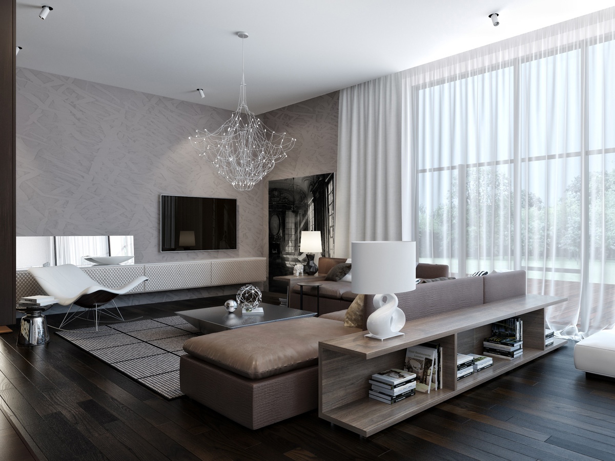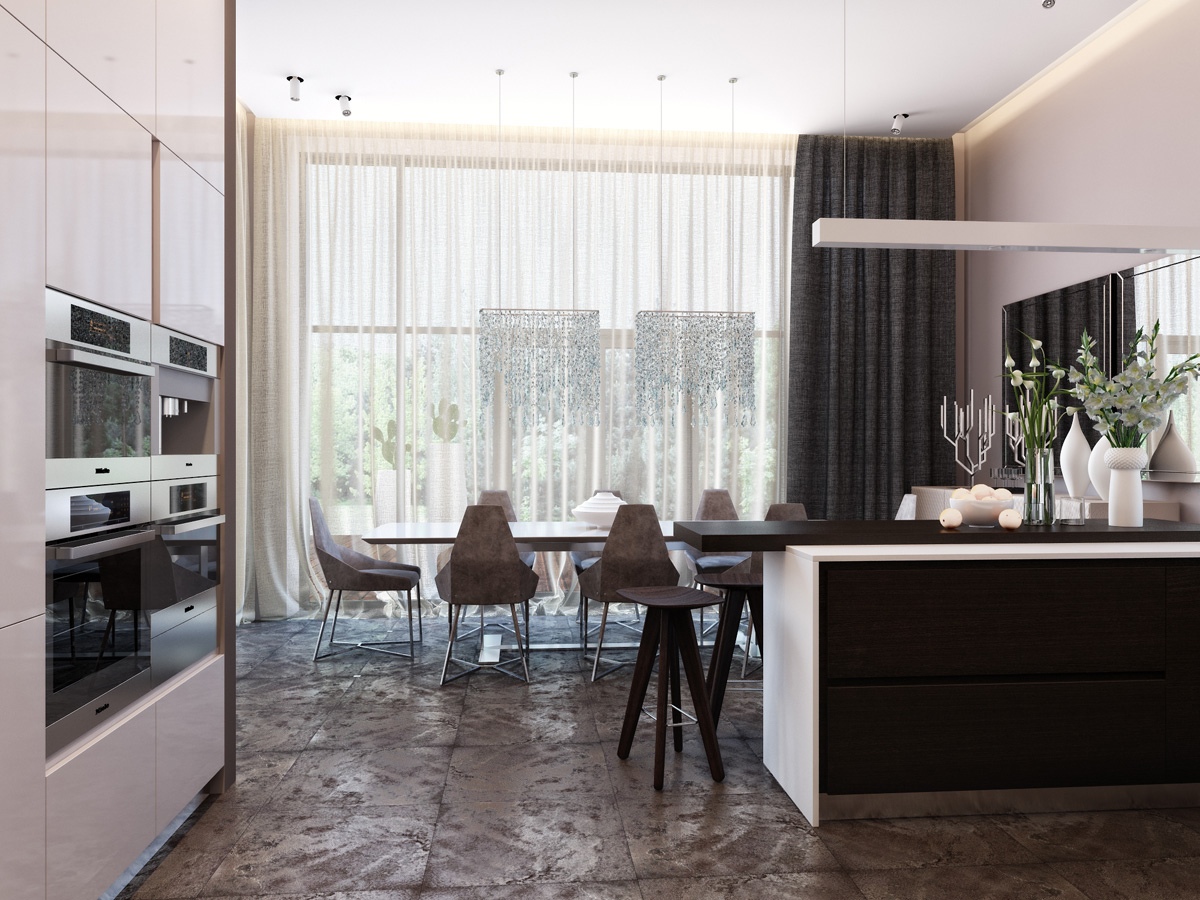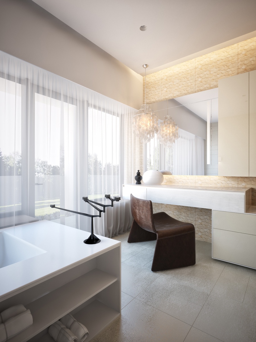 Nội thất nhà ở phong cách hiện đại thiết kế bởi công ty Azovkiy & Pahomova nước Nga nổi bật với hoa văn trang trí ấn tượng. Tông màu trung tính chủ đạo trong nội thất thông qua các yếu tố chất liệu và hoa văn trang trí gây kích thích cảm giác mới lạ một cách trực quan. Gỗ tự nhiên màu tối, đá ốp tự nhiên, chất liệu kim loại kết hợp với hoa văn đặc sắc của thảm lót kiến tạo một không gian sống quyến rũ.