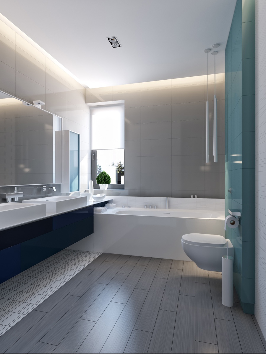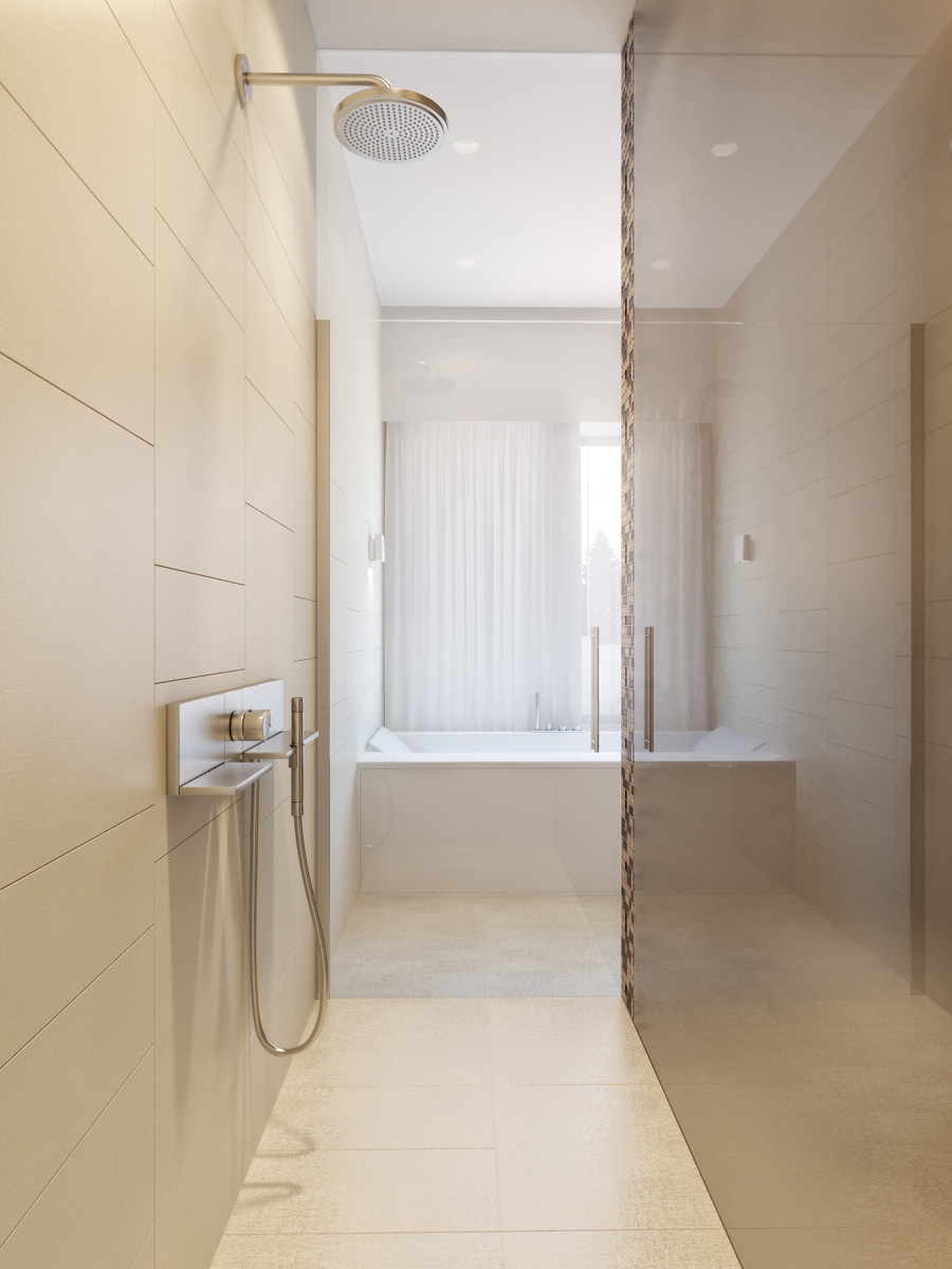 Vì ngôi nhà sử dụng tông màu trung tính làm chủ đạo, nội thất phòng vệ sinh cũng mang những gam màu nhạt như: bồn tắm, bồn cầu, bồn rửa mặt màu trắng, khoảng tường sau bồn cầu màu xanh nhạt, nền gạch màu kem… Tất cả làm nên một kết cấu nhã nhặn và dịu mát.