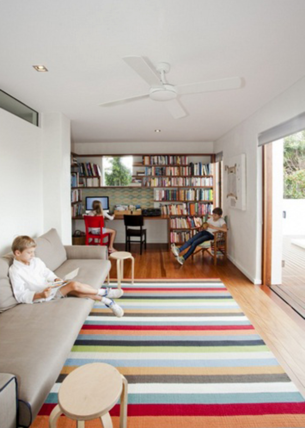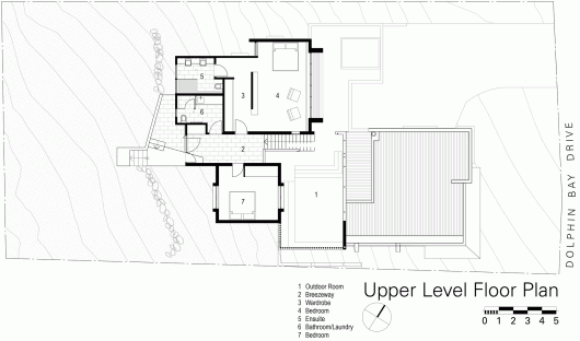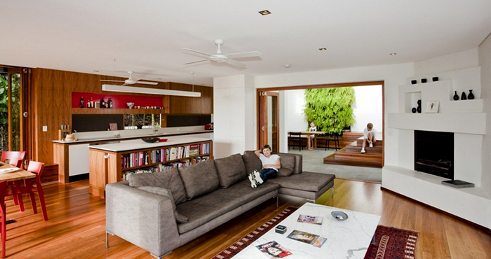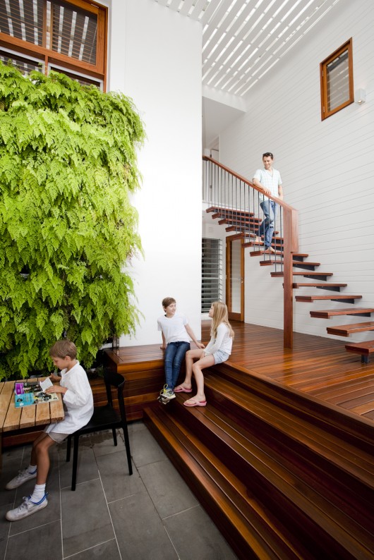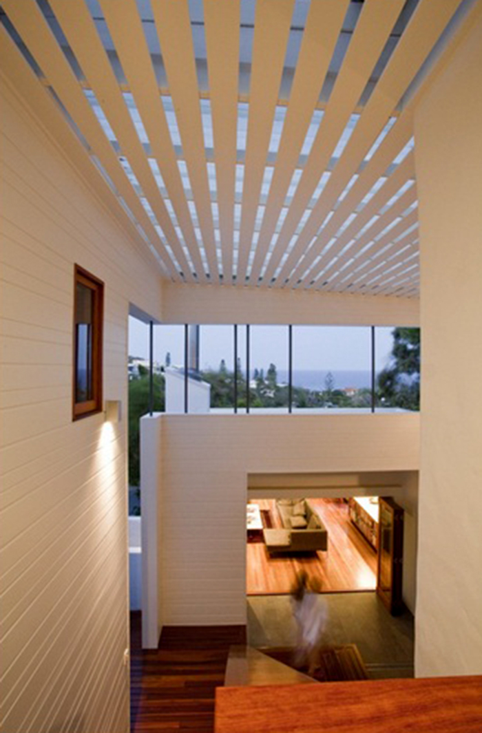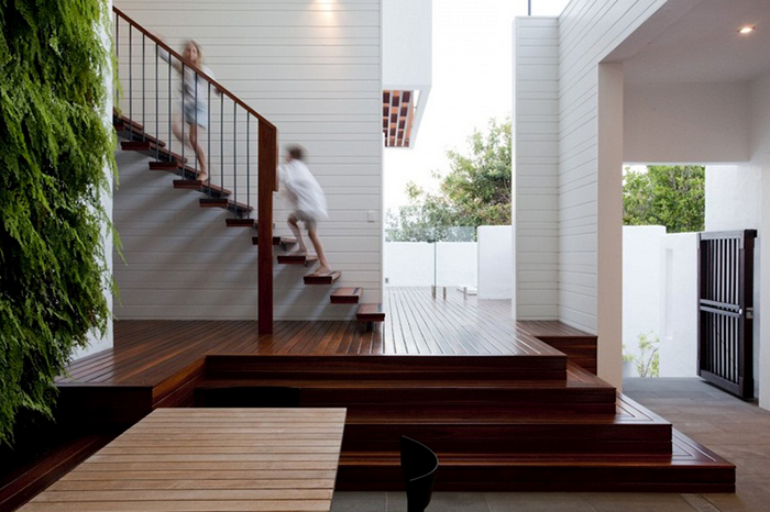 Một hành lang phía trên kết nối nhà với sân sau và vẫn thông qua căn phòng ngoài trời trung tâm để đón gió vào.