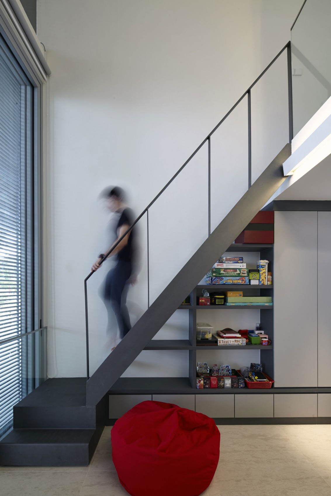 Hướng nhìn ra đường phố từ phía trước nhà ít “rõ ràng” hơn nhìn từ phía sau, trong khi cửa sổ được gắn bằng loại cửa chớp giúp ngăn cách không gian riêng tư của gia chủ. Tầng trệt của ngôi nhà là nhà bếp, phòng ăn, phòng nghiên cứu và một phòng sinh hoạt chung. Một phòng khách rộng rãi và các phòng riêng của trẻ em nằm ở tầng hai. Phòng ngủ nằm ở tầng trên cùng và kèm theo một sân thượng riêng với tầm nhìn bao quát toàn cảnh sườn đồi và các khu vực xung quanh.