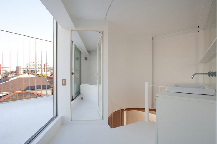 Ngôi nhà diện tích nhỏ của một cặp vợ chồng và các con tọa lạc tại khu vực đông dân cư ở Tokyo. Mặc dù nằm sát với các căn nhà lân cận, kiến trúc sư đã thiết kế ngôi nhà với chủ ý vượt quá không gian chật chội thường thấy trong thành phố. Ngôi nhà có diện tích 4m x 4m, cũng nhỏ như các ngôi nhà ở trung tâm của khu vực rộng 34m2 này. Thiết kế tập trung tạo ra không gian thông thoáng với đầy đủ ánh sáng và gió tràn được vào nhà. Và cũng để tạo ra nhiều không gian sống, kiến trúc sư đã thiết kế ngôi nhà hình một tòa tháp cao 9m. Bên trong ngôi nhà là cấu trúc đơn giản bao gồm bốn tầng lầu và tất cả được nối bằng cầu thang xoắn ốc. Đặc biệt, sàn giữa các tầng được cố ý làm thật mỏng (chỉ dày 70mm) để tạo ra sự kết nối thông suốt toàn bộ không gian của ngôi nhà.