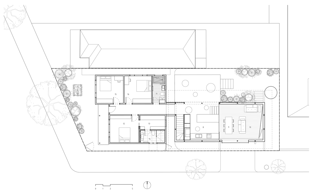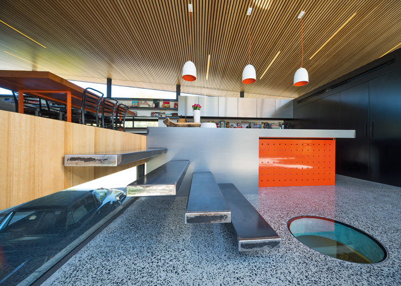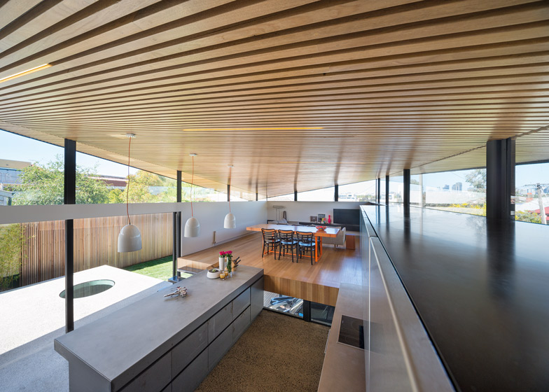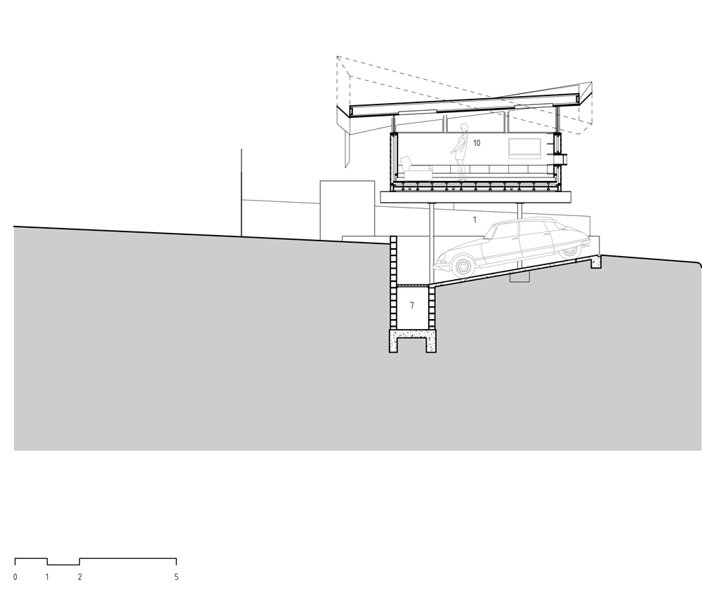 Phần cấu trúc mở rộng độc đáo gồm hai tầng của ngôi nhà gồm một mái nhà lớn vát cạnh tạo hình dáng khí động học cho khung nhà ốp gỗ xuất phát từ cảm hứng của Mullet. Tầng hầm là khu vực nhà để xe thông thoáng, trong khi hai tầng bên trên được bao bọc bởi kính trong suốt. Các phòng ngủ và phòng vệ sinh mới xây thêm cũng nằm ở tầng trên. “Phần mở rộng này không nhất thiết phải hòa hợp với phong cách cũ mà chỉ cần thể hiện chút ít đồng nhất theo ý khách hàng, cùng với việc đón nhiều ánh sáng mặt trời và cảnh quan từ một trong những nơi có tầm nhìn đẹp nhất của thành phố Melbourne là được” – Kiến trúc sư giải thích.