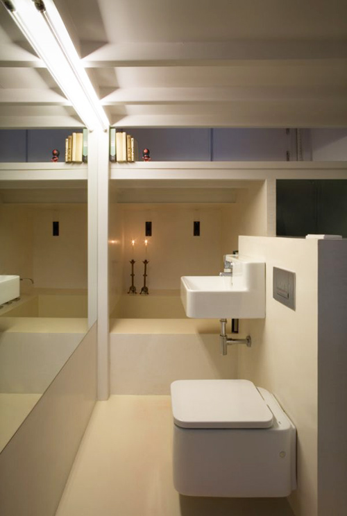 Ngay phía dưới gian bếp là phòng tắm có đủ bồn tắm, chậu rửa mặt và bồn cầu. Bồn cầu treo đầy sáng tạo, tiết kiệm diện tích. Tấm gương to treo trên tường với mục đích tạo “ảo giác” không gian được nhân đôi.