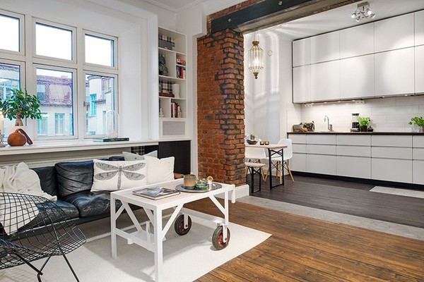 Tổng thể căn hộ là một phòng lớn được chia làm phòng khách và bếp. Hai không gian này được phân chia bằng một vách ngăn mở, tức là tường ngăn chỉ xây một phần nhỏ, đủ để tách bạch 2 phòng mà không dùng đến cửa. Phần tường ngăn xây bằng gạch không trát không chỉ giúp vạch rõ ranh giới của phòng khách – bếp mà còn trở thành điểm nhấn thú vị cho căn nhà.