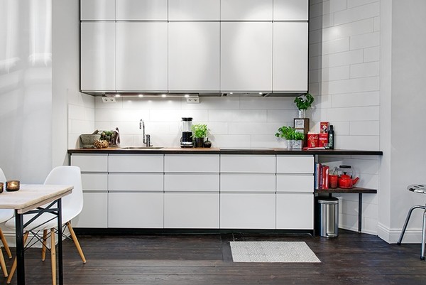 Hầu hết phòng bếp được bài trí gam màu sáng, vừa tạo sự sạch sẽ, vừa giúp căn bếp có vẻ rộng hơn. Không chỉ được ngăn cách bằng đoạn tường gạch mộc mà sàn gỗ tông màu tối hơn phòng khách cũng tạo ra sự phân chia giữa hai phần không gian riêng biệt.