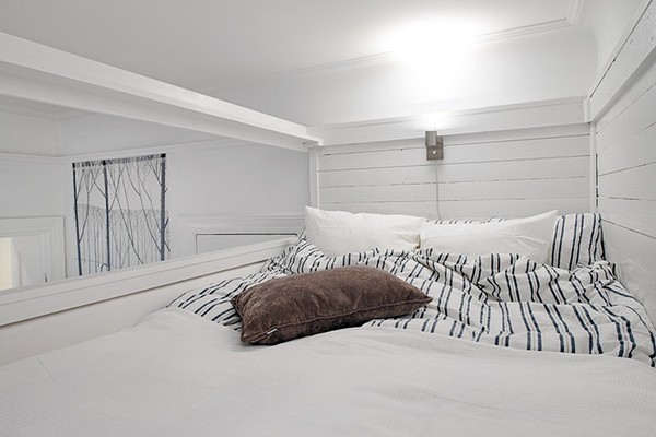 Giường ngủ của căn hộ này khá đặc biệt, nó nằm ngay trong phòng khách và được tích hợp với tủ quần áo thành một khối khép kín. Khối không gian này được thiết kế dưới dạng gác xép: phần tủ ở phía dưới, còn gác xép là giường ngủ với thang lên riêng biệt.