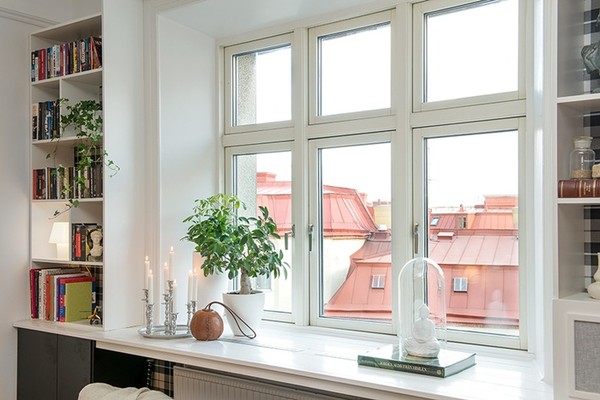 Hệ thống tủ âm lưu trữ khoa học bên cửa sổ giúp nhà gọn gàng.