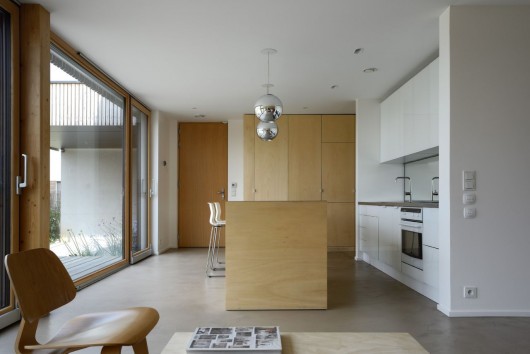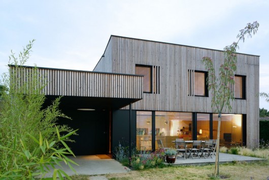 Việc xây dựng ngôi nhà khá là đơn giản. Khung bằng gỗ, được dựng lên trên một tấm sàn bê tông bên dưới và sàn bê tông cho tầng trên, cơ cấu của ngôi nhà là hệ thống mô-đun đúc sẵn. Vật liệu cách nhiệt cho mái nhà là tấm lót dày 40 cm. Tường bao gồm len khoáng sản với sợi gỗ ở bên ngoài, tạo ra một độ dày khoảng 32 cm. Các sợi gỗ giúp làm chậm quá trình làm ấm và làm mát cho ngô nhà. Ở tầng trệt, ba tấm cảm biến đôi bằng kính với một phần cố định và một phần nghiêng chạy dọc theo độ cao trần nhà và khung cảnh xung quanh. Tầm nhìn ra bên ngoài từ các khung cửa cũng được chú ý thiết kế để không bị gián đoạn.