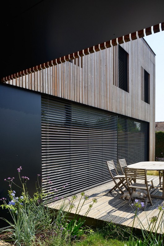 Dự án đầy hiệu quả này là mảnh đất vuông vứt 10 x 11m. Dọc theo phía Tây của tầng trệt là một nhà để xe có vách ốp nhựa giả gỗ sơn đen, phần mái che trước garage được mở rộng kéo dài ra hiên trước. Công trình có bố trí rất thoáng, các không gian được sắp xếp xung quanh hệ thống lõi chức năng của ngôi nhà bao gồm: kho, đường ống, phòng tắm và nhà bếp. Tất cả các phòng được sắp xếp bố trí xung quanh lõi trung tâm này.