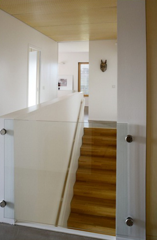 Mặt tiền nhà hướng về phía Nam và phần lớn được lắp kính nhằm tăng năng lượng mặt trời cho ngôi nhà. Lớp kính này có lớp bảo vệ để kiểm soát ánh nắng mặt trời theo từng mùa. Tầng trên được thiết kế gợi mở ra phía Đông và Nam, trong khi phía Bắc thì đóng kín còn phía Tây chỉ chừa những kẻ hở nhỏ cho khu vệ sinh và nhà tắm.