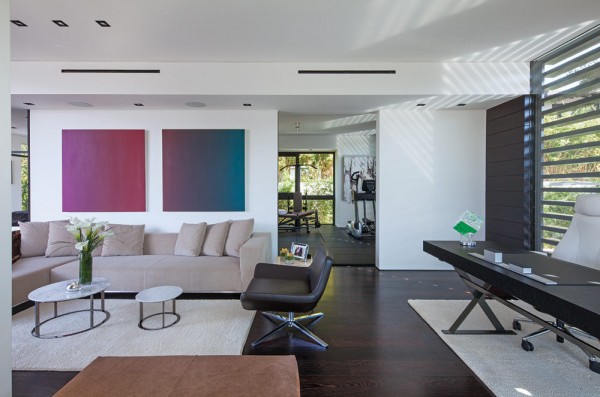 Phòng cho khách riêng biệt được nối bằng cầu thang xoắn ốc với khung kính bao quanh. Biệt thự còn có phòng nghiên cứu và phòng tập thể dục gồm một bar nhỏ bên trong.
