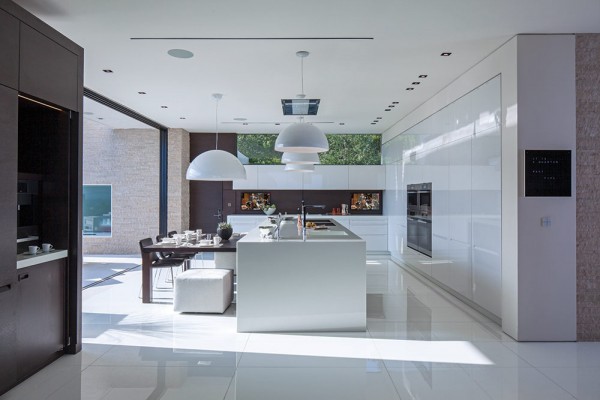 Phòng khách, phòng ăn và bếp được xây dựng hợp lý nhằm tận dụng lợi thế về tầm nhìn tuyệt vời ra khung cảnh bên ngoài. Ngoài ra, nội thất bên trong gồm tủ sơn mài tuyệt vời từ Ý và các thiết bị ứng dụng đầy nghệ thuật cũng giúp tăng thêm sự sang trọng cho ngôi nhà.