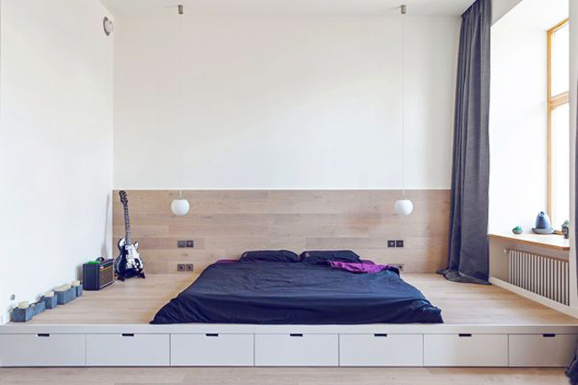 Đối diện với gian bếp là phòng ngủ. Có lẽ đây là phòng ngủ đơn giản nhất mà các bạn từng thấy. ‘Căn phòng’ được phân định bằng thiết kế độ can sao khác nhau. Hơn nữa, khoảng chênh lệch đó còn được tận dụng để bố trí hệ tủ kéo trữ đồ cực kỳ tiện lợi.