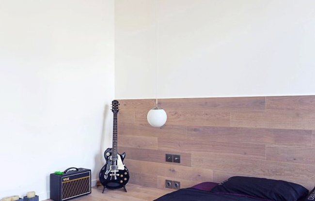 Gỗ được ốp cao lên bức tường phía sau khoảng 60 phân nhằm tạo điểm nhấn. Phụ kiện trang trí cũng được tối giản, chỉ trưng bày những đồ vật yêu thích hoặc thật phong cách như chiếc rương, cây đàn ghi-ta…