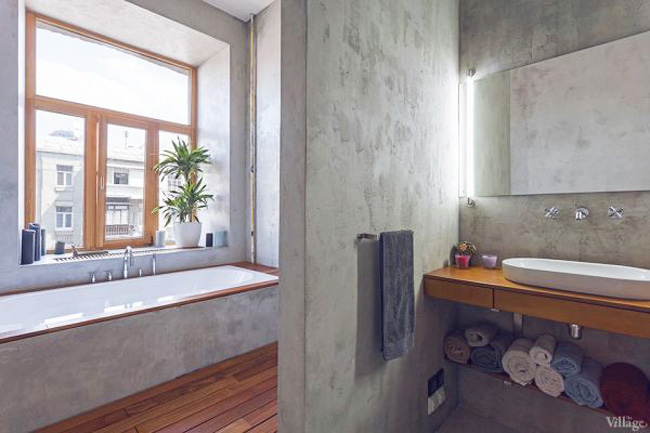 Khu vực bồn tắm bên trong cũng được thiết kế độ cao tầng khác nhau – một cách phân định ranh giới đơn giản mà hiệu quả. Sàn nhà ốp gỗ đảm bảo sự sạch sẽ cho không gian sử dụng nhiều nước như phòng tắm.