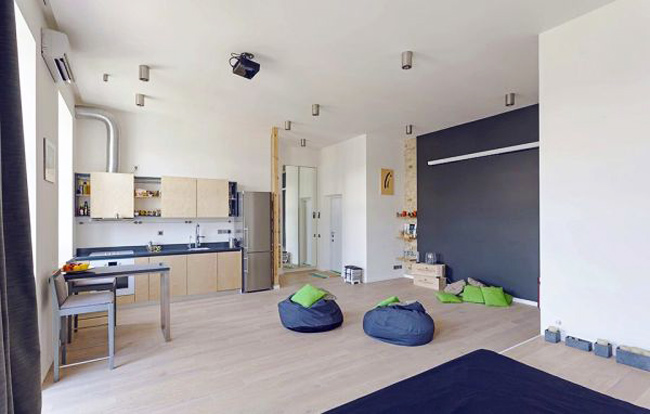 Căn hộ này nằm ở thành phố Kiev, Ukraine. Nó là một căn hộ dạng studio (Studio là từ dùng cho các căn hộ loại nhỏ, không phân chia không gian, với diện tích tối đa chỉ khoảng 58m2) mà ban đầu là một căn hộ 2 phòng. Nó đã được “biến đổi” thành một không gian đáng yêu bởi bàn thay của KTS Dan Vakhramieiev – giám đốc sáng tạo tại FILD.