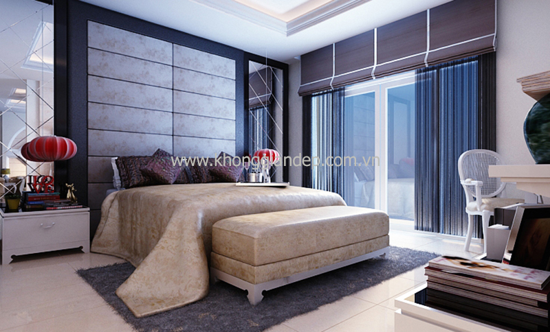 Phòng ngủ với rèm cửa xanh da trời thanh thoát