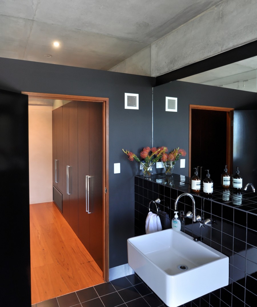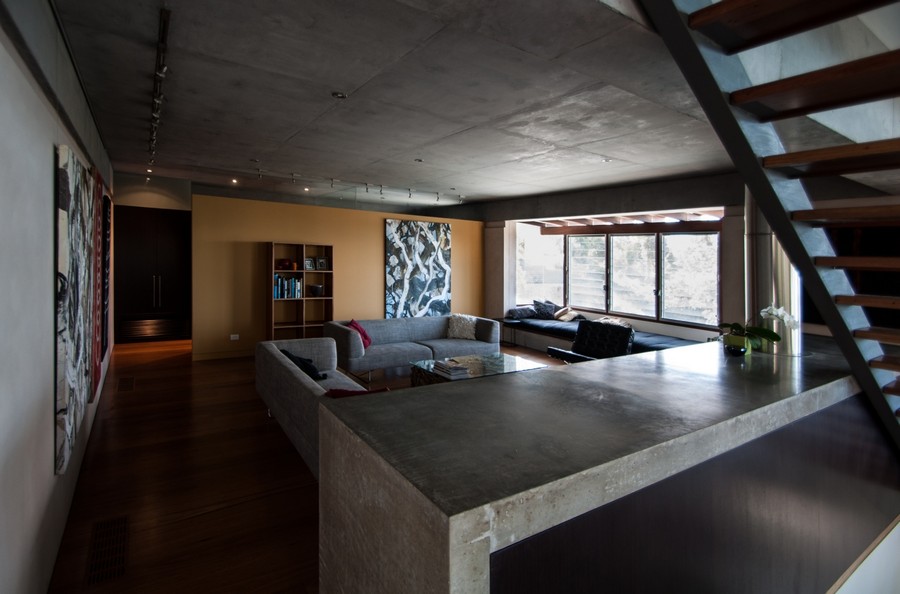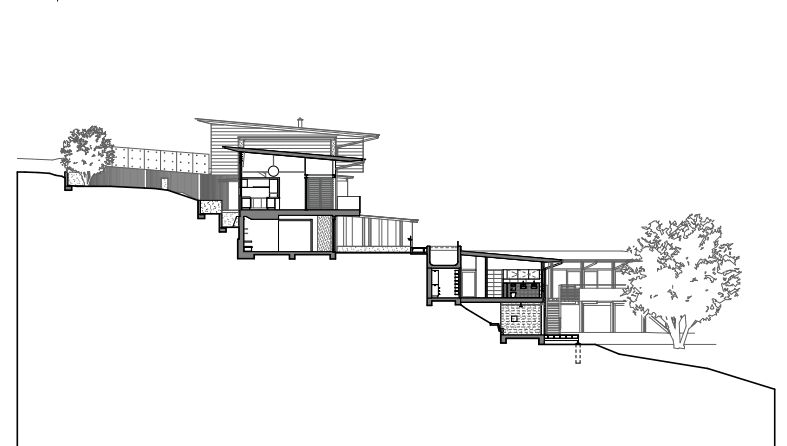 Phần chứa các phòng ngủ của ngôi nhà được xây dưới thấp theo hình dáng của mảnh đất, nơi vốn là khu vườn thiên nhiên gần gũi. Khu vực này mang hình dạng hình học lưng chừng dọc theo chiều dài cheo leo.