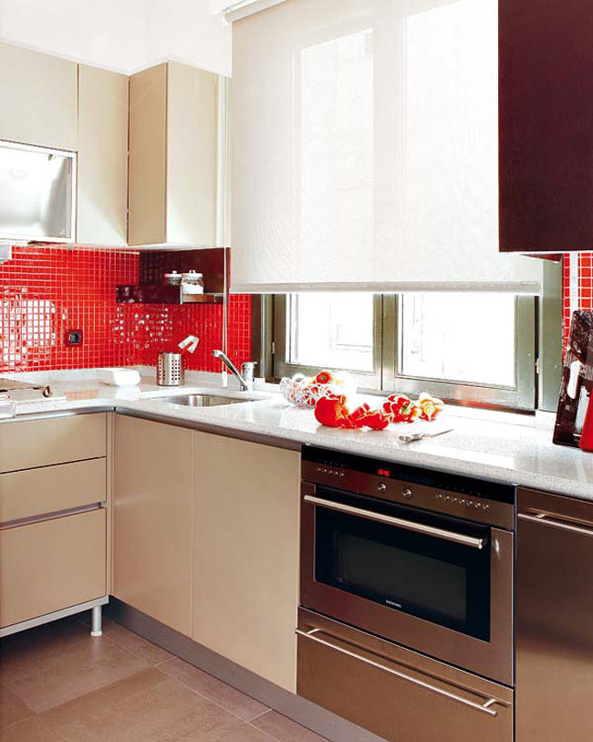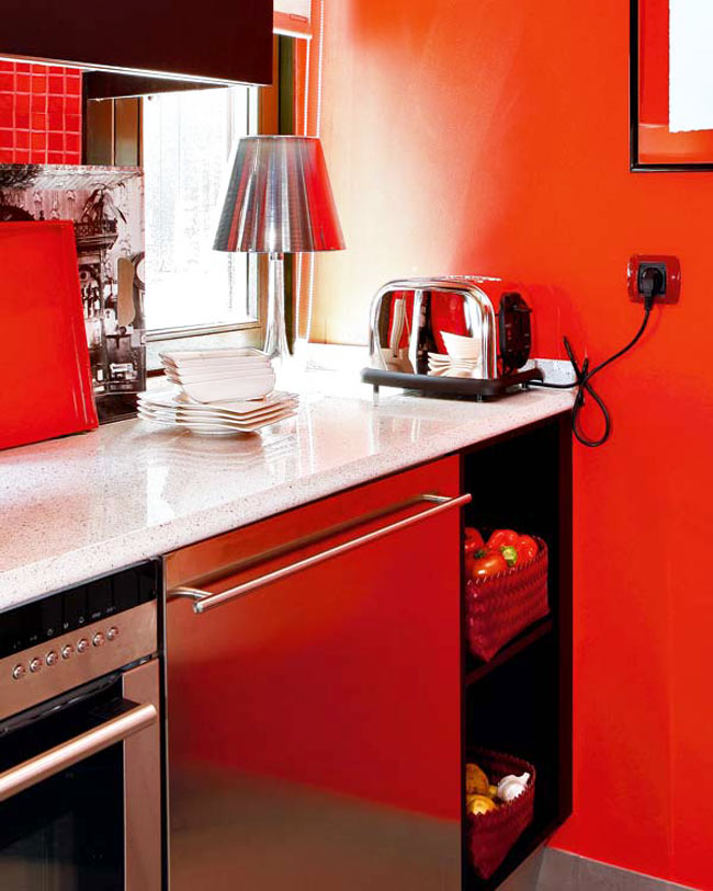 Phòng bếp có thiết kế chữ L cổ điển nhưng không thiếu đi nét hiện đại, tươi sáng nhờ bức tường bếp ốp gạch men màu đỏ tươi. Đây là cách sử dụng màu sắc khá táo bạo bởi lẽ màu đỏ là màu tràn đầy năng lượng, nếu không khéo léo sẽ rất dễ phản tác dụng.