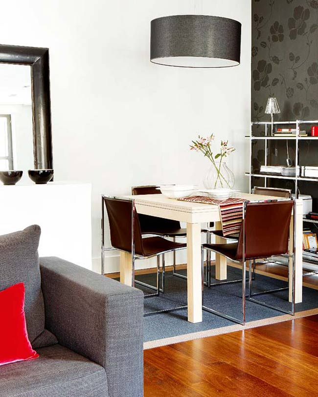 Phần còn lại của phòng khách dành để bố trí một bộ bàn ăn xinh xắn, nhỏ gọn đủ cho bốn người. Bàn ăn và khung ghế đều có thiết kế vuông góc, cứng cáp nên phần lòng ghế làm bằng da thể hiện sự uyển chuyển, mềm mại cho khu vực ăn uống này.