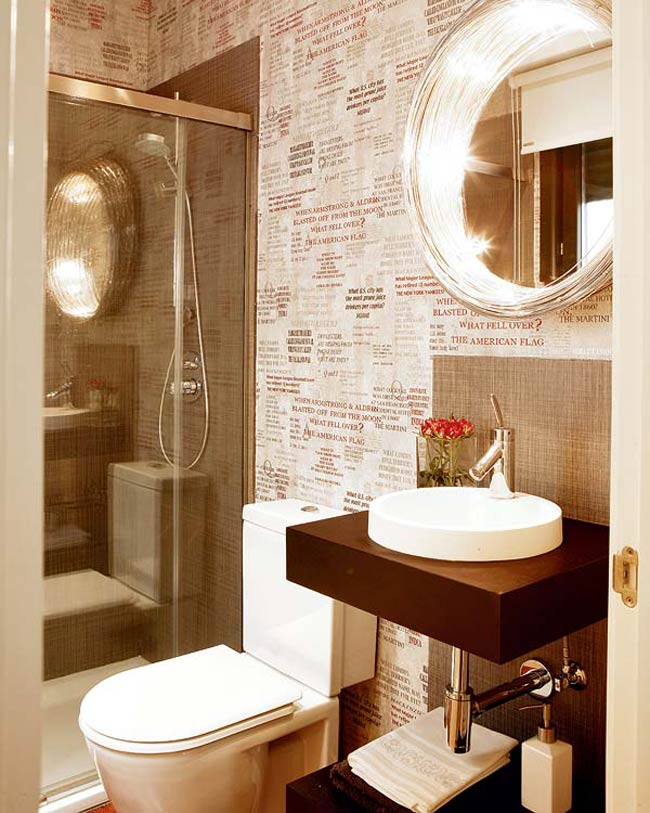 Giấy dán tường họa tiết hoa, in chữ là ý tưởng hay làm nổi bật được nét đẹp đơn giản, cá tính cho không gian phòng tắm.