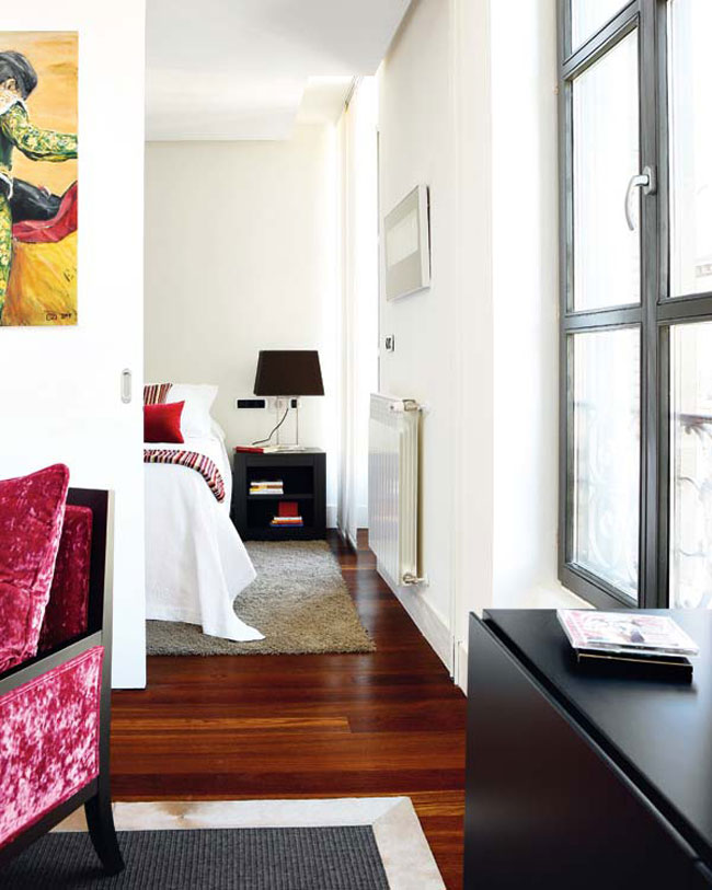 Phòng ngủ có màu trắng làm chủ đạo – lựa chọn số 1 cho những không gian nhỏ. Màu trắng sẽ mang đến cảm giác không gian như được nới rộng so với thực tế. Để tránh sự tẻ nhạt, chủ nhân đã dùng đến những chiếc gối ngủ màu đỏ, họa tiết kẻ, đèn ngủ màu nâu và tủ quần áo với phần cánh tủ làm bằng kính màu.