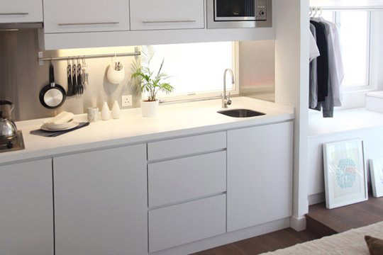 Đây là cái bếp rất sạch của Kin. Với màu trắng này, có vẻ như Kin sẽ chỉ uống sữa tươi hoặc ăn ở ngoài đường…