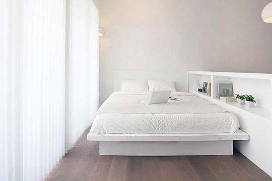 Đầu tiên là giường ngủ ở cuối nhà nhé, ngăn cách với ban công bằng màn cửa trắng, và ngăn với khu khách bằng cái kệ lửng.