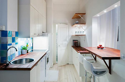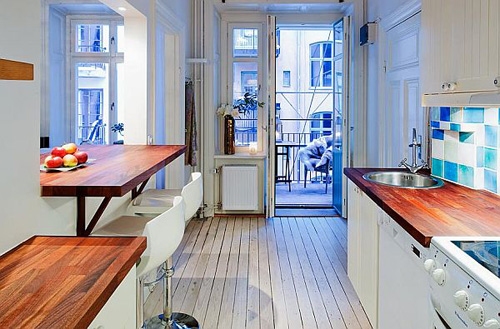 Phòng bếp kiêm phòng ăn có màu trắng chủ đạo, nhấn nhá chút màu tối của gỗ và những viên gạch ốp tường màu xanh lấp lánh. Ở phía đối diện là phòng tắm.