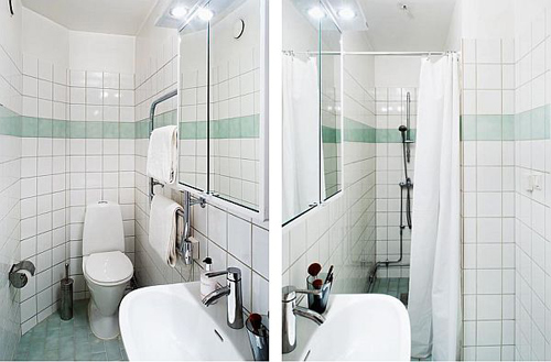 Phòng tắm giản dị nhưng vẫn có đủ tiện nghi tối thiếu. Căn phòng sở hữu sàn nhà màu xanh ngọc rất đáng yêu.