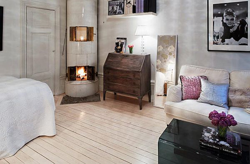 Cuối phòng có lắp lò sưởi nhân tạo, một chút ánh lửa hoặc ánh nến vàng cũng đem đến cảm giác ấm áp cho ngôi nhà nhỏ. Khu vực tiếp khách giản dị với sofa đài màu be, gối ôm màu sắc và bàn trà màu đen đối lập cá tính.