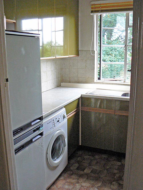 Hiện trạng phòng bếp của ngôi nhà rất nhỏ, chật và hẹp. Hệ tủ bếp màu mè và lỗi thời, sàn nhà bằng đá giả, thiếu trầm trọng không gian lưu trữ có thể sử dụng được. Giải pháp cải tạo được lựa chọn với mục tiêu biến phòng bếp trở nên tiện nghi, rộng rãi và thu hút hơn.