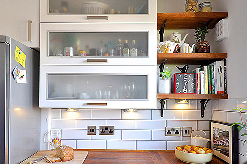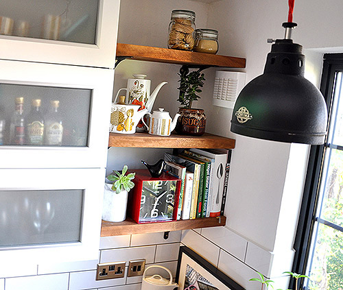 Kệ mở bố trí trong góc giúp căn bếp trở nên thông thoáng hơn.