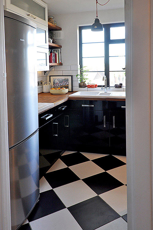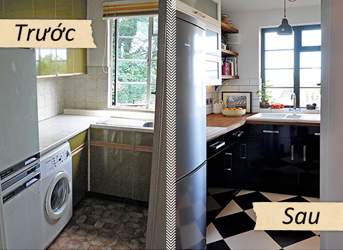 Sàn nhà lát đá giả cũ mòn được thay thế bằng gạch men họa tiết bàn cờ rất thời thượng. Bộ đôi màu cổ điển đen – trắng được sử dụng sáng tạo cho sàn nhà và tủ bếp.