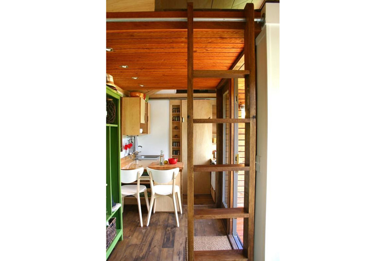 Phía xa là nhà bếp kiêm phòng ăn, ghế màu sáng để không có cảm giác chật. Còn đây là thang dẫn lên gác xếp – chính là phòng ngủ. Cái thang này ngó hơi nguy hiểm.