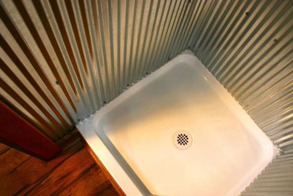 Phòng tắm đứng có vách kim loại. Sàn bên ngoài bằng gỗ, nên nếu mua nhà, bạn nên sắm thêm mấy tấm thảm nhà tắm để nước văng ra không ướt sàn.