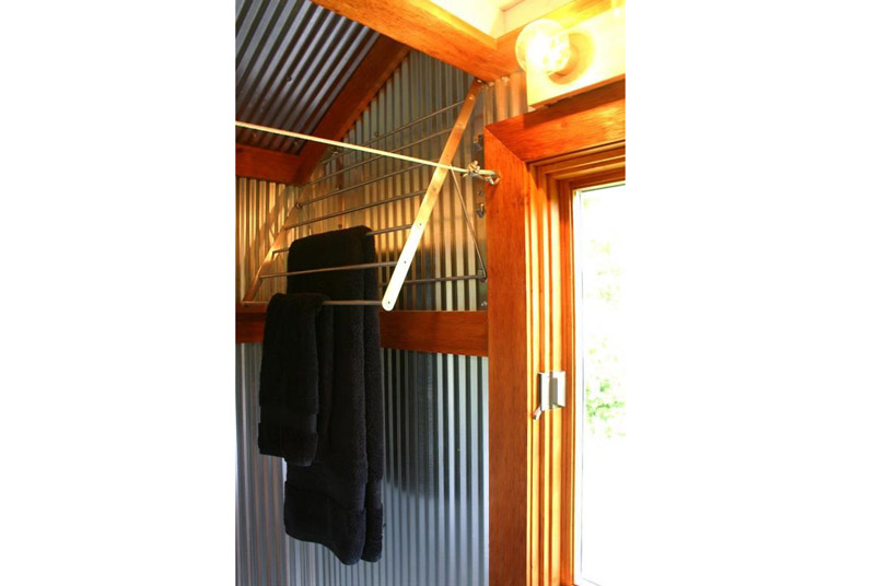 Nhìn kỹ nhé, phòng tắm rất tiết kiệm không gian, với giàn treo khăn, treo đồ đóng ngay cạnh đó. Chú ý một chi tiết: tắm xong mở cửa ra là nhà tắm khô ráo ngay, không giống nhiều nhà tắm mỹ miều khác bị ẩm ướt suốt ngày và tối thui thui.