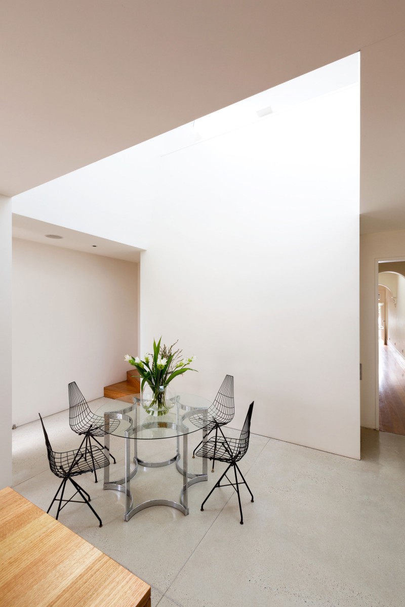 Nội thất sắp xếp theo phong cách tối giản với các yếu tố quan trọng tạo nên những tính năng và cảm giác hấp dẫn: “Các bức tường thạch cao trắng, trần và sàn nhà bê tông, tủ, cửa sổ, cửa ra vào bằng gỗ sồi và sàn Blackbutt tạo cảm giác ấm áp. Sâu vào bên trong là nhà bếp và phòng khách với không gian nhỏ gọn, mặt bằng mở rộng đón ánh sáng nhịp nhàng. Các cửa ra vào được thiết kế trượt càng giúp tăng độ thoáng và rộng mở cho ngôi nhà“. (Ảnh: Tom Ferguson)