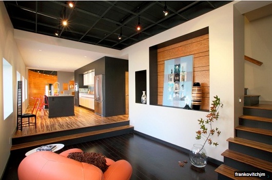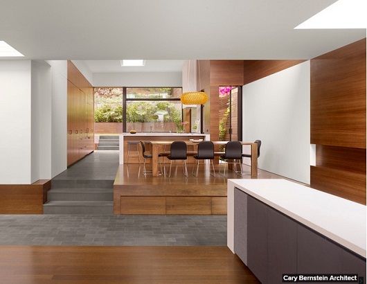 Sự khác biệt về màu của sàn gỗ nhà bếp và phòng bên cạnh kèm theo bậc thang là sự chuyển tiếp hoàn hảo giữa hai không gian. Để ý kỹ hơn ngay cả trần nhà của hai căn phòng cũng có những thay đổi về màu sắc và độ cao.