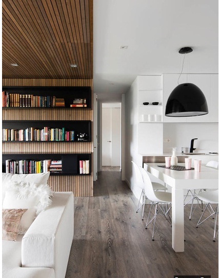 Hai không gian sống trong ảnh dưới được phân chia bằng việc thay đổi chất liệu của trần nhà.