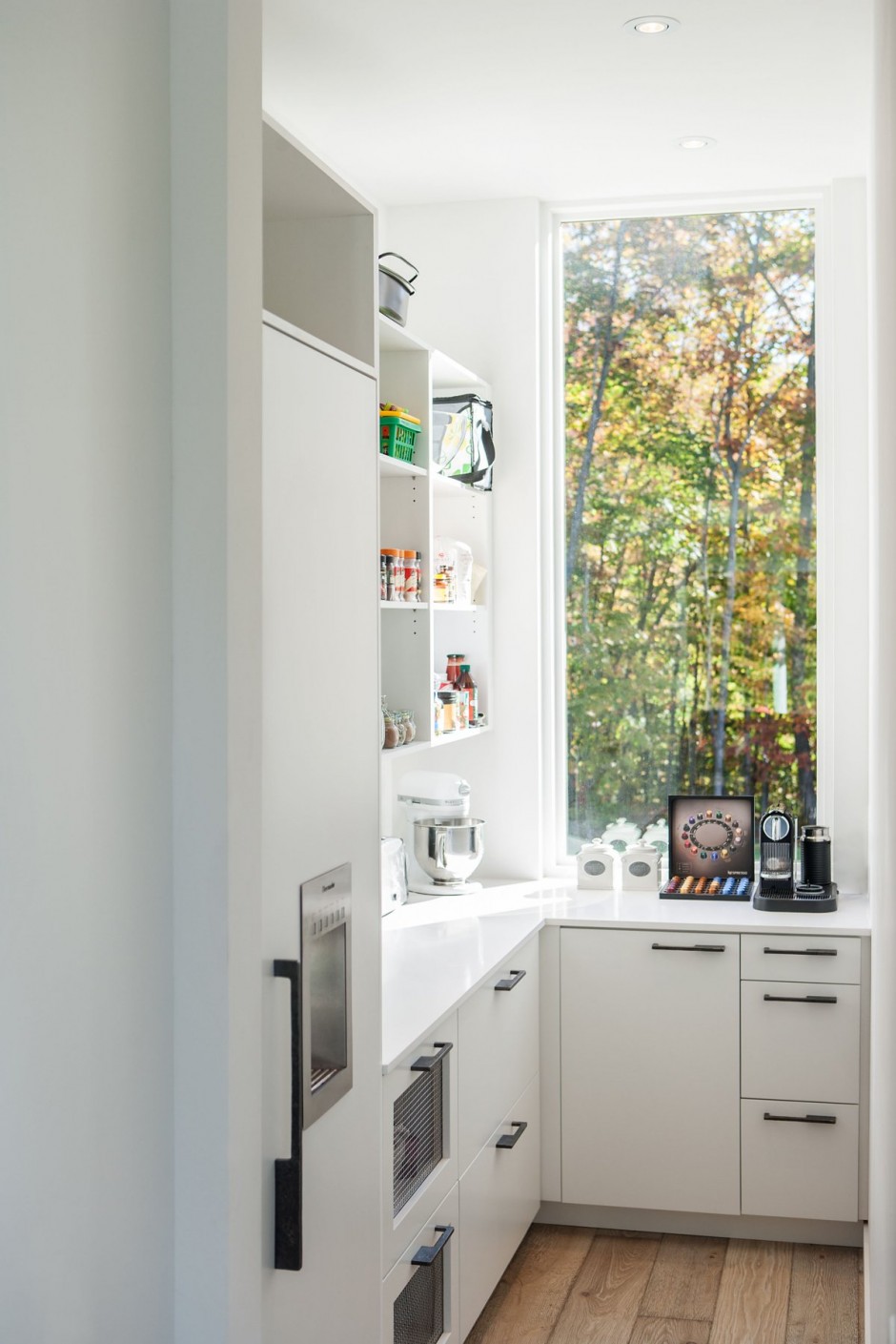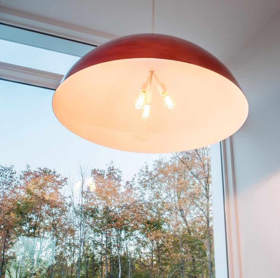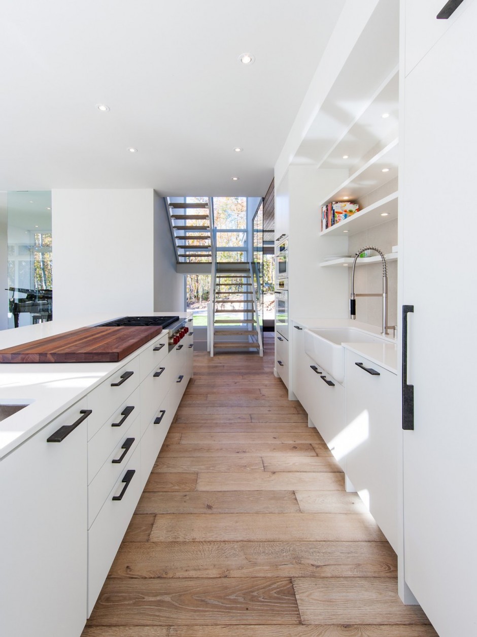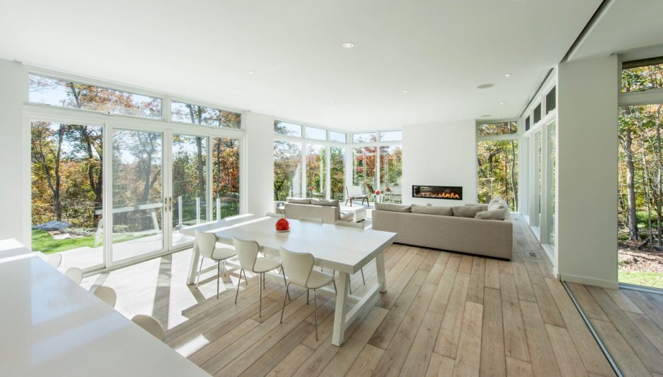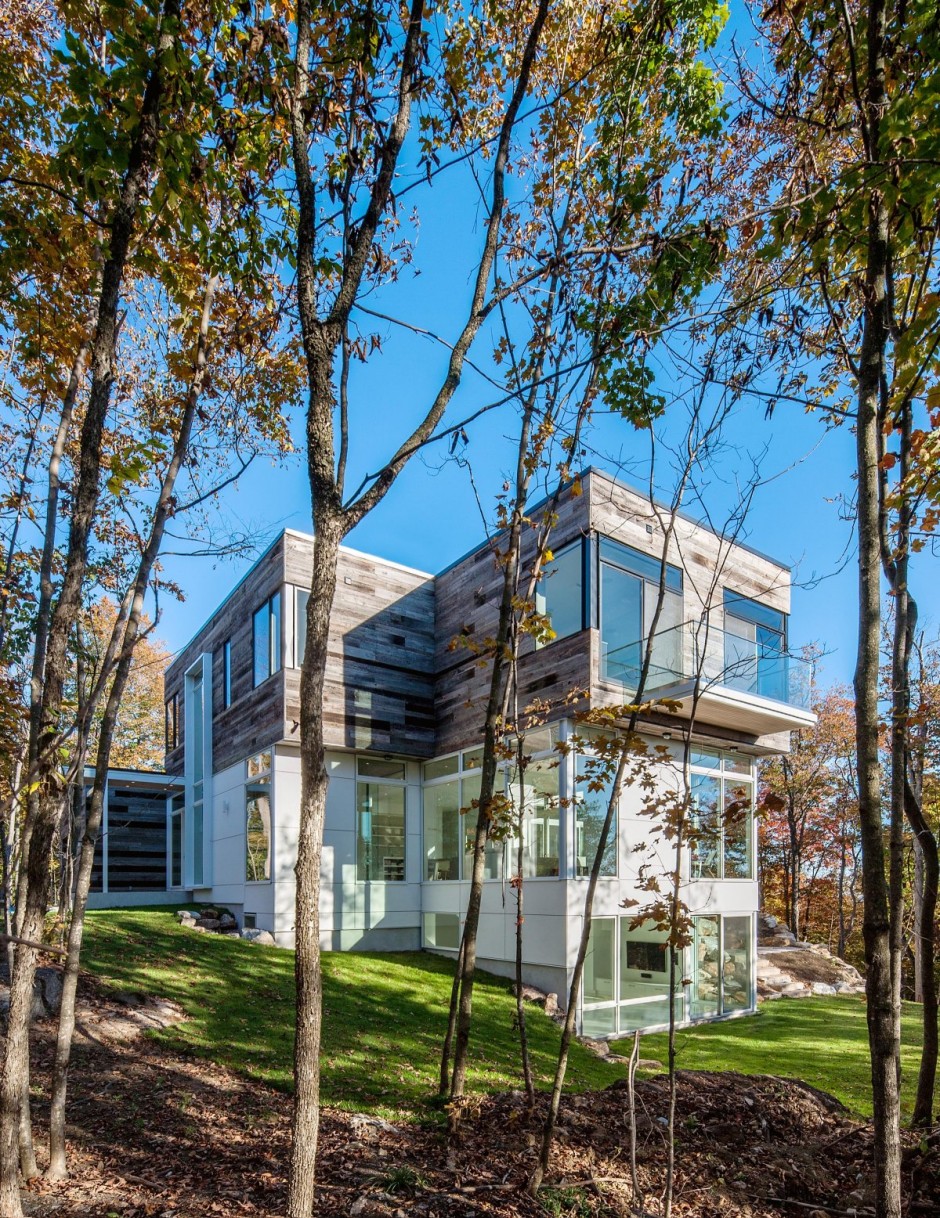 Nhìn từ bên ngoài, ngôi nhà có thể tạo cảm giác hơi bất thường, nhưng ngay khi khám phá sự hòa quyện tuyệt vời của màu sắc và vẻ đẹp của ánh sáng tự nhiên trong từng ngõ ngách của ngôi nhà, bạn sẽ hiểu lý do tại sao tất cả mọi thứ ở Gatineau Hills đều tạo nên vẻ đẹp mê hồn. “Việc sử dụng gỗ khai hoang cho tầng hai bên ngoài ngôi nhà và bột xi-măng trắng cùng với vật liệu kính cho tầng trệt giúp tạo sự cân bằng trong kết cấu chung. Nội thất bên trong được trang hoàng mộc mạc nhưng hiện đại với sàn gỗ sồi được xử lý thủ công và sơn phết sơn mài màu trắng bên ngoài“.