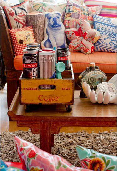 Thùng đựng coca cũ trở thành khay đựng sách báo và những vật dụng nhỏ khác.