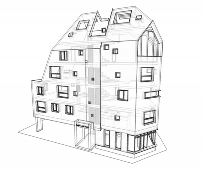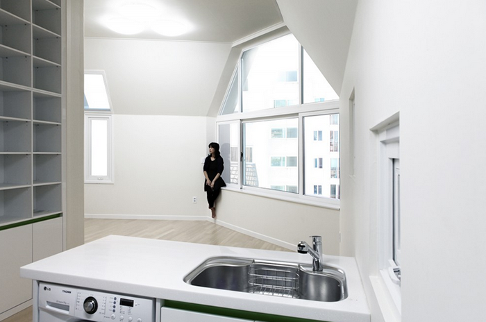 Tòa nhà nằm giới hạn trong một khu vực rất nhỏ, thậm chí nhỏ ngay cả với một căn nhà: rộng 8 mét và dài 20 mét, diện tích mặt bằng là 175m2. 9 căn hộ mini ở ghép đã được xây trong cùng một tòa nhà 5 tầng nhỏ nhắn này. Đây cũng là trường hợp chung cho tất cả những căn nhà cho thuê tại Hàn Quốc khi việc xây dựng phải thu được lợi nhuận và mang lại giá trị kinh tế, đồng thời cũng tạo nên sự dễ chịu và làm hài lòng người thuê nhà.