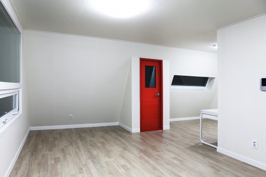 Cửa ra vào mỗi căn hộ được sơn màu đỏ, còn cửa sổ lớn có tầm nhìn xuống các con đường nhỏ nhắn ở Seoul. Các kiến trúc sư đã tận dụng tối đa vị trí của mảnh đất khi thiết kế các cửa sổ ở một mặt có tầm nhìn, giúp kết nối mỗi căn hộ với không gian mở bên ngoài vì ba mặt còn lại của tòa nhà đều đối mặt với đường phố ồn ào.