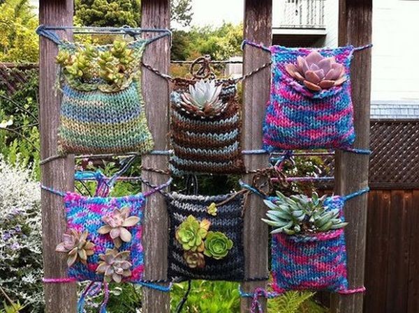 Bạn nghĩ sao về một vườn cây treo với chậu cây là những túi len? Không chỉ độc đáo nhờ kiểu dáng, mà màu sắc như những đóa hoa của những cuộn len màu sắc cũng giúp cho khu vườn mini trở nên thu hút hơn.