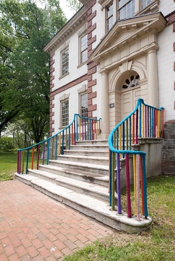 Một ý tưởng cực độc đáo là trang trí cầu thang với len. Tuy đây là một việc làm không dễ dàng vì nó đòi hỏi nhiều thời gian, công sức và sự tỉ mẩn, nhưng khi hoàn thành, những gam màu rực rỡ sẽ khiến chiếc thang nhà bạn trở nên độc đáo hơn bao giờ hết. Tuy nhiên cách trang trí này sẽ gặp rủi ro lớn nếu như trời mưa… nên bạn có thể áp dụng cách này cho những cầu thang trong nhà.